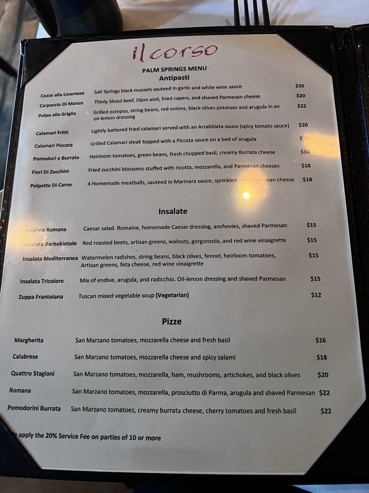 Il Corso - Palm Springs offers a wide range of Italian dishes with a focus on seafood, making it a trendy and upscale dining destination. From the delicious PIZZE options like the Calabrese with spicy salami to the indulgent ANTIPASTI E INSALATE such as the Calamari Fritti, every dish is crafted with care and flavor. The restaurant provides vegan and vegetarian options, catering to a variety of dietary preferences. Il Corso also offers a range of amenities, including outdoor seating, waitstaff service, and even accepts cryptocurrency payments. The menu is complemented by a selection of non-alcoholic beverages and a full bar for those looking to unwind. Overall, Il Corso - Palm Springs is a must-visit for those seeking a delicious and memorable dining experience in Palm Springs.